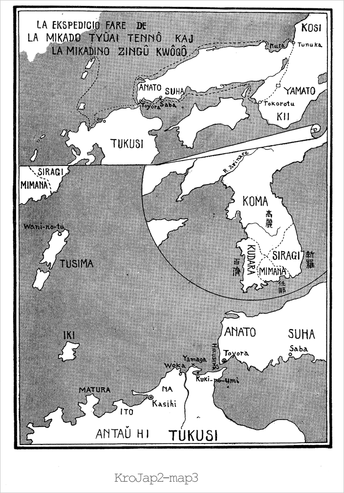 Haniyasu-hiko vidis Hiko-kunihuku'n de malproksime, kaj demandis: — „Kial vi levis armeon kontraŭ*12 mi?“ Tiam Hiko-kunihuku responde diris: — „Vi, malbenito, maltimema kontraŭ Dio, intencas renversi la Mikadan Tronon. Mallojalulo devas esti punfrapata. Mi do levis la armeon de justeco, kio estas la ordono de la Mikado.“ Ili reciprokis pafadon. Haniyasu-hiko unua pafis; sed la sago ne trafis Hiko-kunihuku'n. Tiam Hiko-kunihuku pafis; la sago trafis Haniyasu-hiko'n ĉe l' brusto, kaj baldaŭ li mortis. Ĉiuj soldatoj forkuris tute malkuraĝiĝintaj. Oni postkuris, kaj venkobategis ilin ĉe la norda bordo de la rivereto. Pli ol duono de*8 malamika armeo estis mortigita, kaj la kadavroj kovris la tutan valon kvazaŭ superfluo. Tial oni nomis la lokon Hahuri-sono.(8) Kiam la malkuraĝiĝintaj soldatoj forkuradis, fekaĵoj elfalis tra la fendoj de iliaj pantalonoj. Iuj forĵetis kirasojn kaj forkuris; aliaj, kiuj ne povis kuri, kliniĝis vizaĝaltere kaj kriis: „Akimi!“ (Kompaton, sinjoro!) La loko, kie oni formetis la kirasojn, estis nomata Kawara (kiraso); la loko, kie fekaĵoj elfalis, estis nomata Kuso-bakama (fekaĵo-pantalono), kaj poste la vorto ŝanĝiĝis je Kusu-ba; kaj la loko, kie ili kliniĝis vizaĝaltere, estis nomata Akimi.